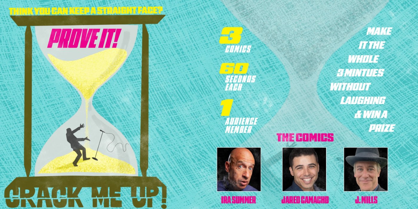 Three comics, one audience member. Each comic gets 60 seconds to make you laugh. If you can face all three without cracking up, you win a prize!