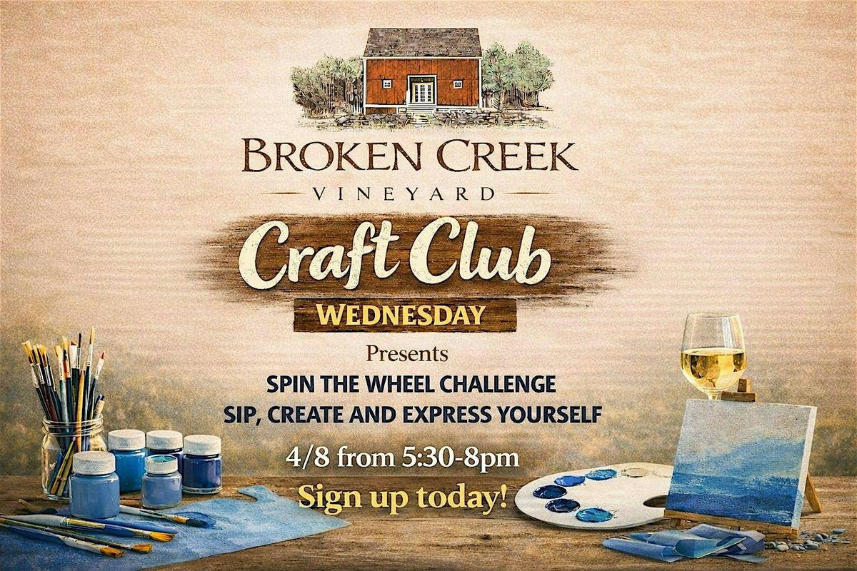 Ready to shake up your paint night? Join us at Broken Creek Vineyard for our Spin the Wheel Challenge, where creativity meets surprise! Each spin decides your fateβthe colors, the medium, and even the accent color youβll use. No two masterpieces will be the same!