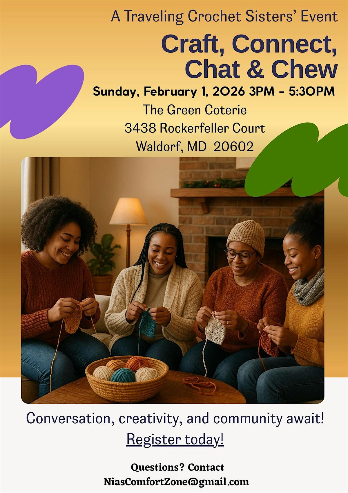 Come join "Craft, Connect, Chat & Chew", A Traveling Crochet Sisters' Event, hosted by Nicole, of Nias Comfort Zone, at The Green Coterie for a fun-filled day of crocheting, connecting, chatting, and chewing!