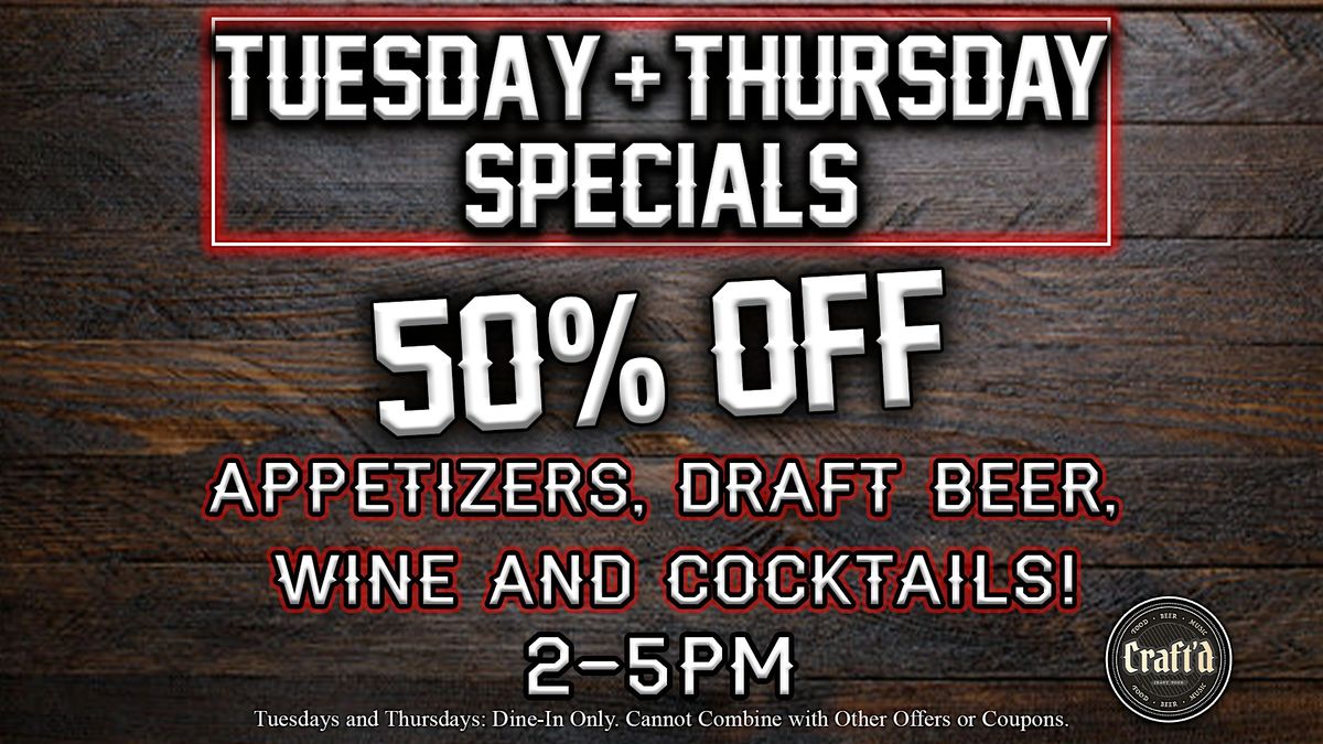 Tuesday & Thursday 2โ5pm: 50% Appetizers, 50% Off Draft Beer, Wine & Cocktails. *Dine-In only. Cannot combine with other offers or coupons.
