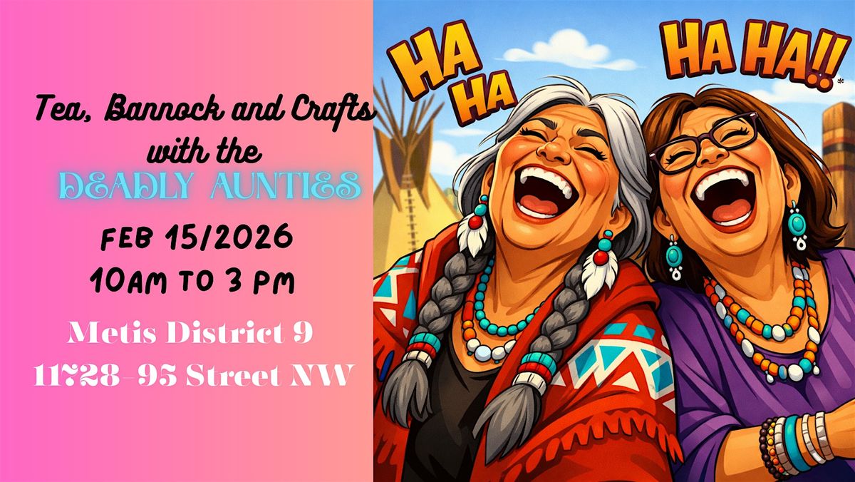 Spend time with two of the DEADLIEST AUNTIES around, create 2 take home crafts, enjoy Tea & Bannock with a side of BIG AUNTIE LAUGHTER!!