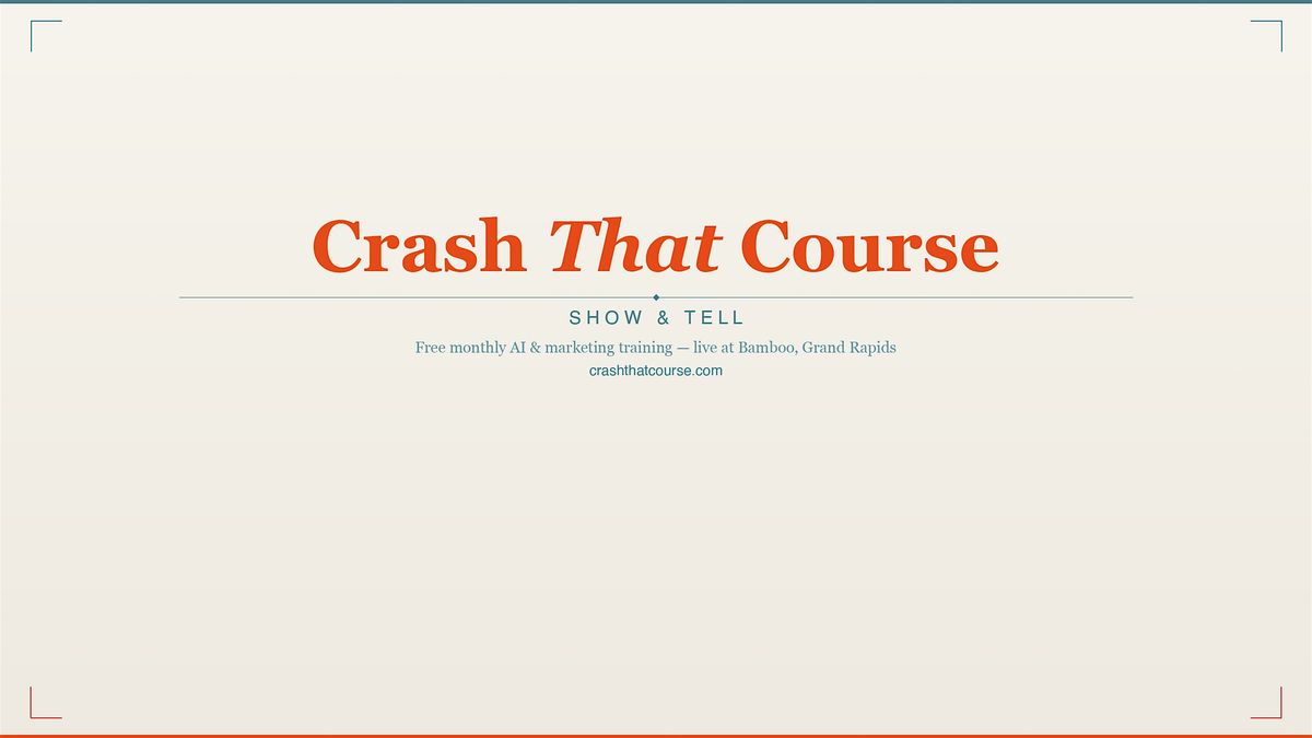CrashThatCourse Show & Tell is a free monthly series focused on Claude, Claude Code, Claude Cowork, and AI agents. Each session features live demonstrations, real workflows, and hands-on discussion about what's actually possible with these tools right now.This series is built for people who want to see AI agents in action -- not just hear about them. Bring your laptop, bring your questions, and see what others are building.Specific topics and demos for each session will be announced as the schedule allows.Free to attend. In-person at Bamboo Grand Rapids.Organizer: Tim HainesWebsite: CrashThatCourse.com