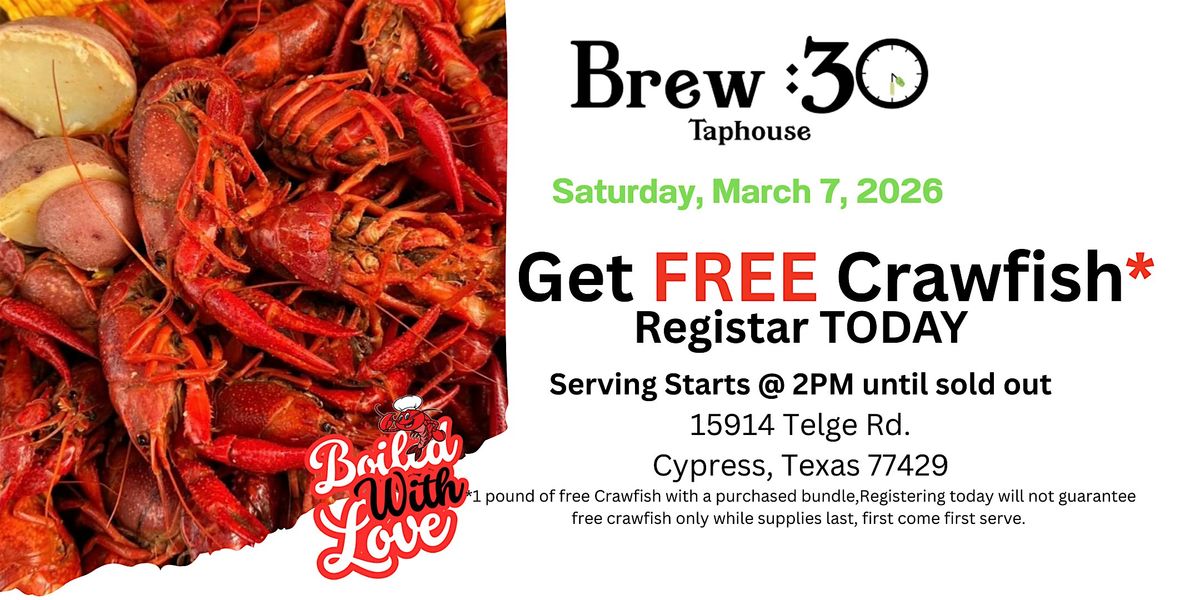Get Ready for the Crawfish Boil Pop Up at Brew:30 Taphouse! Get a FREE Pound Crawfish on us with bundle purchases*