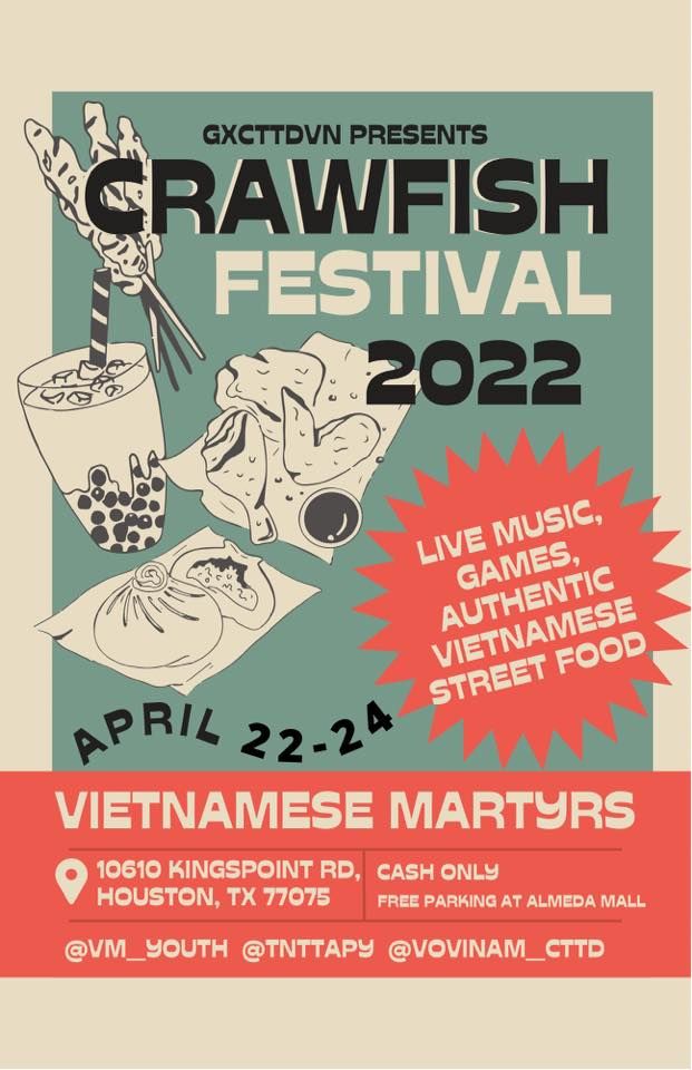 ?Crawfish Festival is Here! FRI-SUN , 4/22-24?Come and check out the night life with live music, games for the kids, authentic Vietnamese grub (Banh Mi, Banh Cuon, Grilled Pork skewers, Pho, Spring Rolls, Egg Rolls , & more) & of course CRAWFISH!