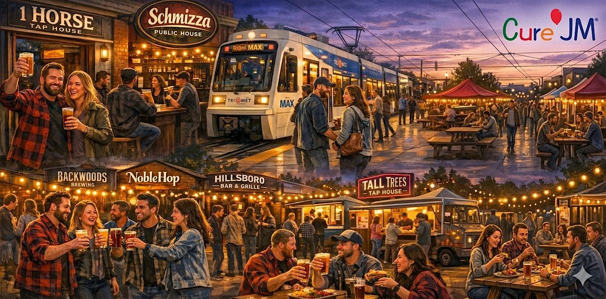 Info: 1. One Horse Tap House 2. Schmizza Public House 3. Blue Line Max transit from Orenco station to 3rd street in Hillsboro. 4. Backwoods Brewery 5. NobleHop 6. Hillsboro Bar and Grill 7. Tall Trees Tap House and food carts at Weil's arcade.