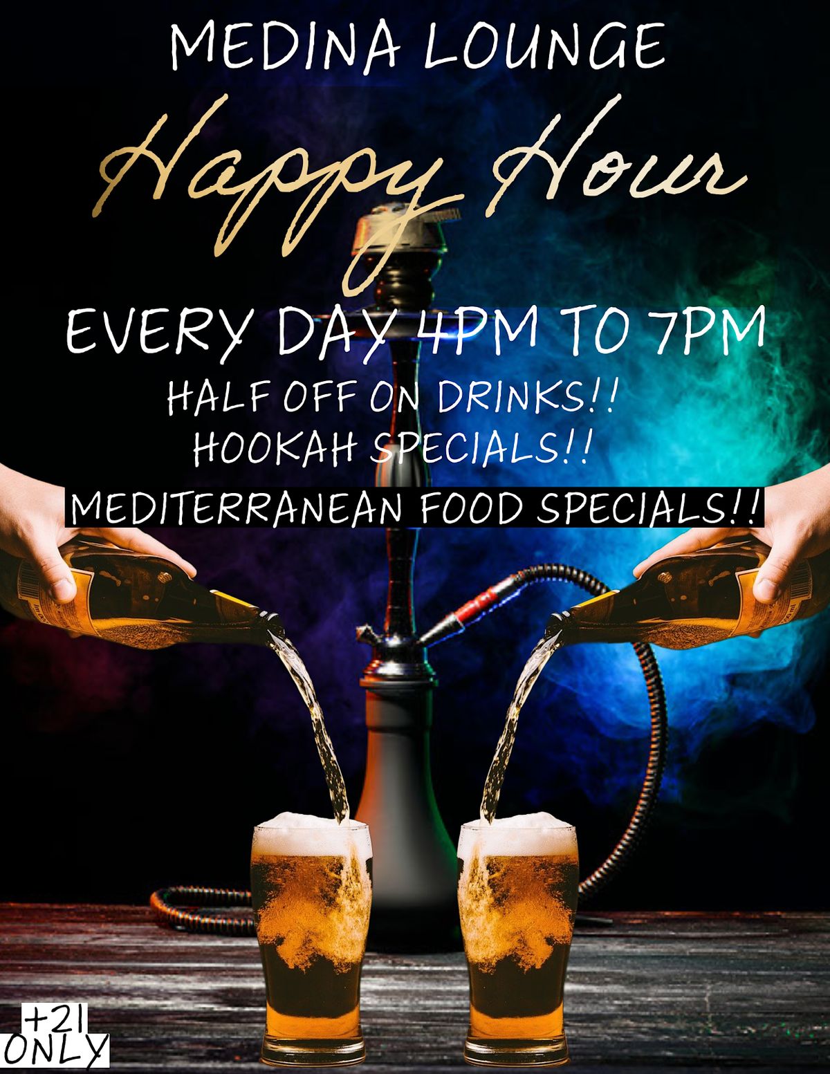 COME JOIN US AT NEW LOUNGE MEDINA MEDITERRANEAN KITCHEN AND LOUNGE, EVERY DAY FROM 4PM TP 7PM, WITH THE BEST QUALITY PRICES HAPPY HOURS IN TOWN!!