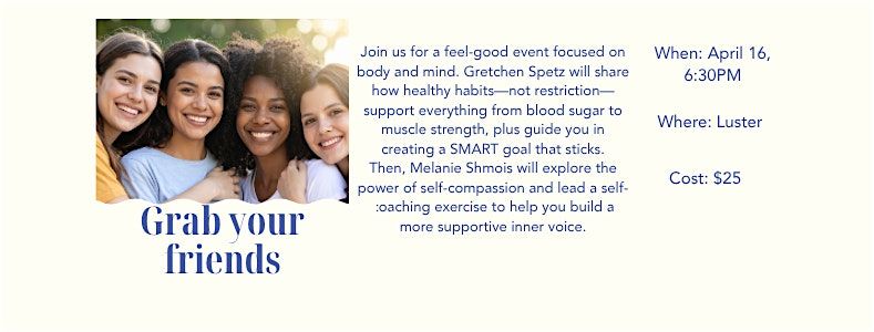 Join us for a well-rounded wellness event designed to support both your physical and mental health. You’ll learn how to build realistic, sustainable nutrition habits that support your body, while also exploring the power of self-compassion to improve your mindset and inner dialogue. Through simple, interactive exercises, you’ll leave with practical tools to create lasting habits and feel more confident in your everyday routine.