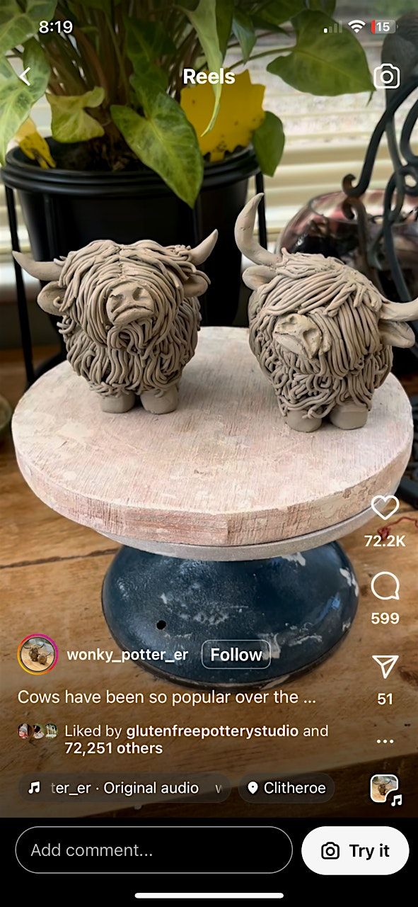 Bring your herd out for this fun class! With a little Flingin Pots instruction you'll construct a 5" ceramic Hairy Coo!. Using pinch pots to create the body, students will construct a cow body, decorative hair and creative embellishments to make a one of a kind Highland Cow. Flingin pots will take these back to our studio to high fire and clear glaze. Coos will be ready for pick up back at the location made 1 month later.