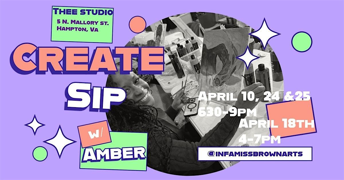 Join us at Thee Studio in Hampton for Create And Sip! Choose from multiply dates in April, for a chill session of creativity and good vibes. Pick your template, sip your favorite drink and unleash your inner Picasso as you laugh, and unwind with Amber "Infa Miss" Brown. Whether you’re a pro or just wanna have fun, this event’s all about letting loose and making cool art. Don’t miss out on a laid-back evening filled with snacks, color and connection! Please follow me on FB & IG @infamissbrownarts to see some highlights from past events or contact me with any questions.