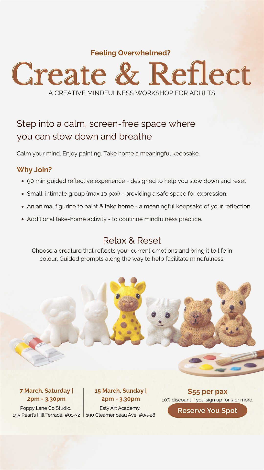 This is a 90-minute space designed for you to slow down, breathe, and practice mindfulness through painting. You’ll choose an animal figurine that resonates with you — something that reflects where you are emotionally. It becomes your starting point, an easy way to begin creating.
