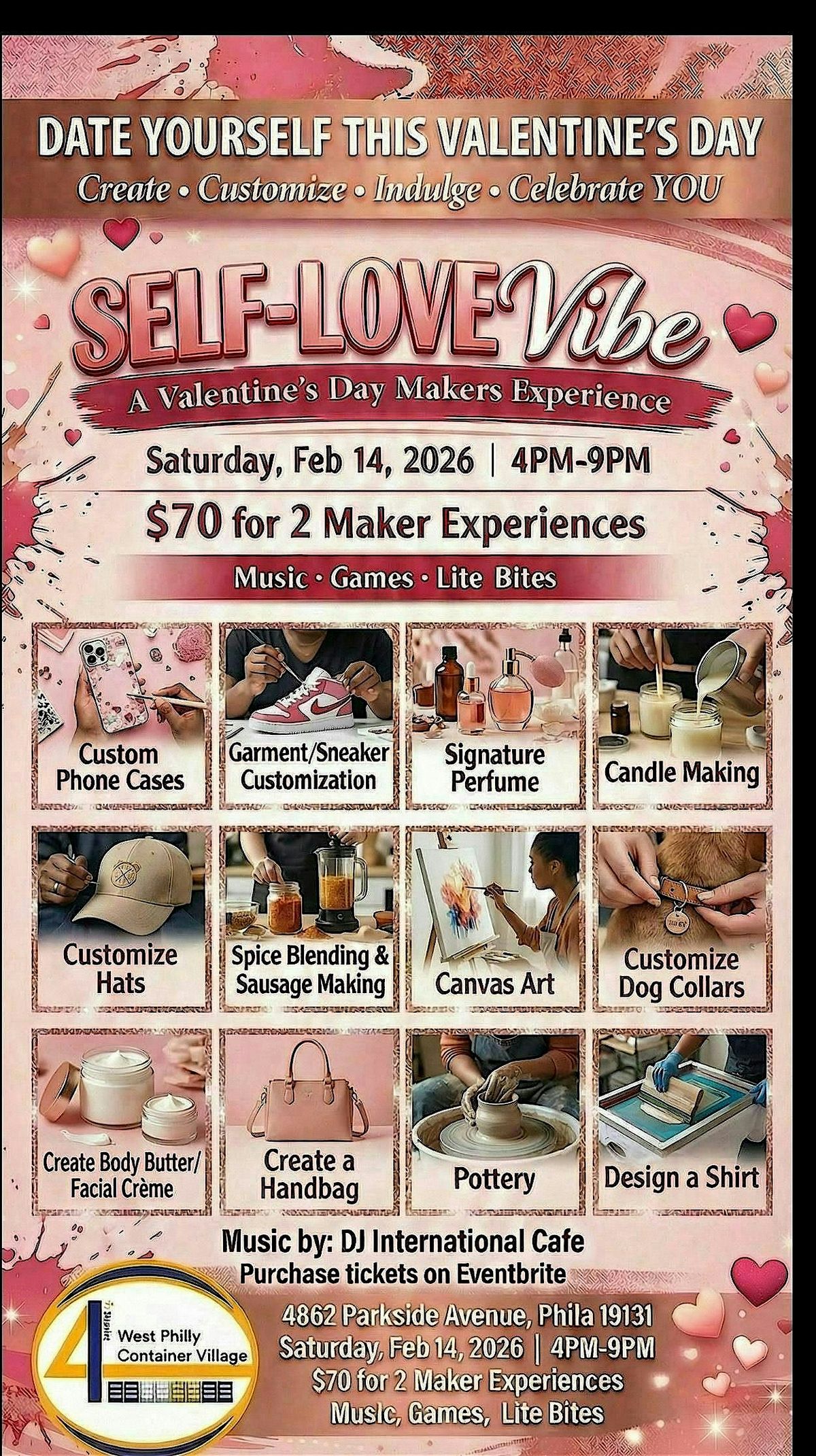 Self-Love Vibe is a Valentine’s Day experience centered on self-care, creativity, and joy. Guests curate their own self-love journey by selecting any 2 hands-on maker experiences for $70, while enjoying music, games, lite bites, and food truck eats. This event is perfect for: