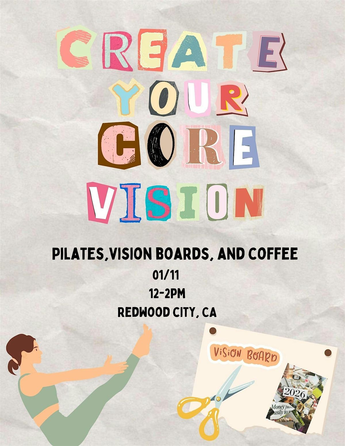 We’ll start with a 45-minute Pilates class to activate your core and reset your mind, followed by a social vision board hour where you’ll bring your dreams to life.