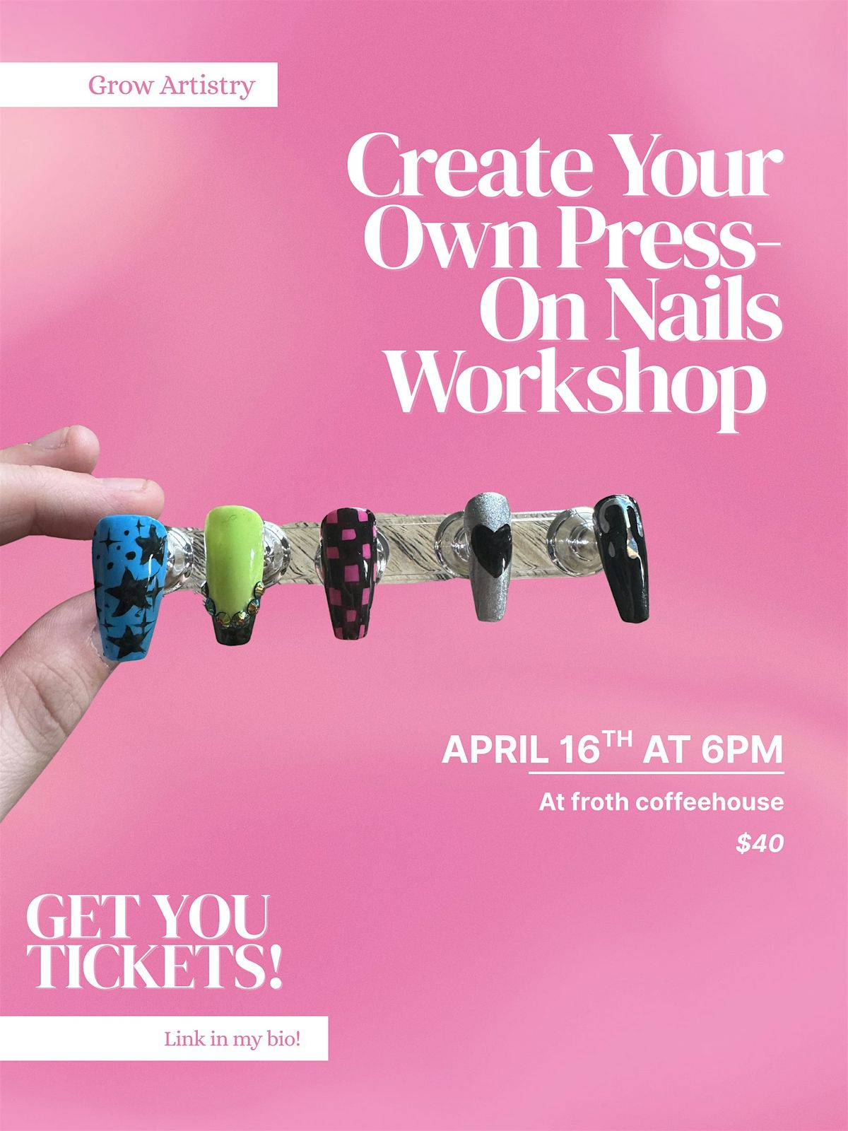 You’ll get to experiment with colors, patterns, charms, and nail art techniques while creating a nail set that fits your personal style. By the end of the class, you’ll leave with a custom set of press-on nails and the knowledge to make more at home!
