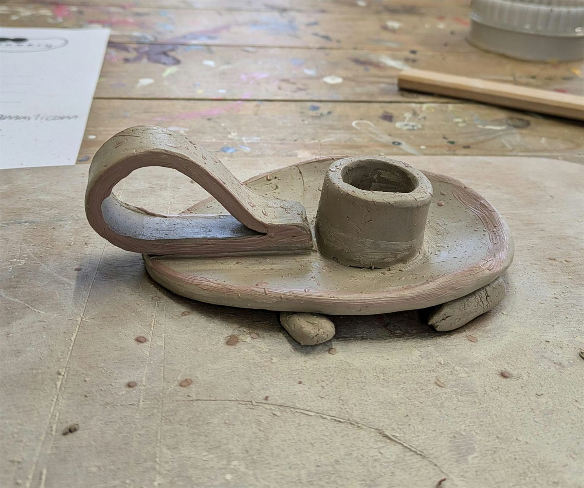 Create a unique candlestick using slab building techniques and decorate it with coloured slip.