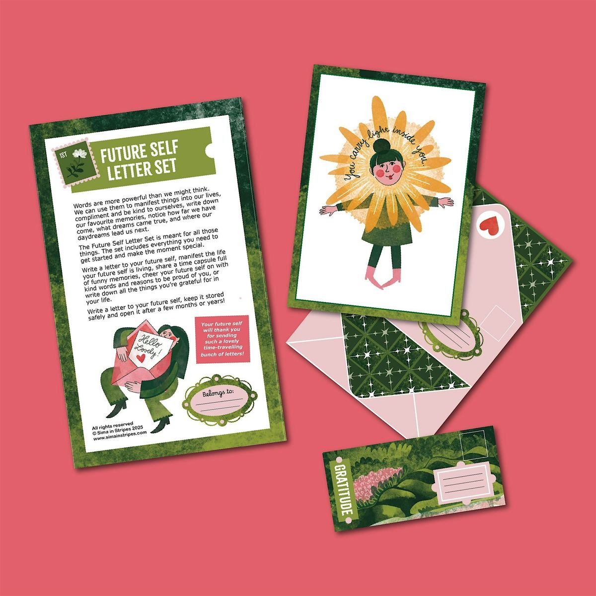 Exclusive ticket: Workshop ticket which includes the entry, a little introduction from Sima, 2-3 future letters designed by Sima in Stripes, for you to use on the day and keep after the workshop. Materials to create 1-2 small stamps to take with you. Tools needed to write your letters and create your stamps. Brand new Future Self Letter Set designed by Sima in Stripes, included with your exclusive ticket. The Future Self Letter Set includes: