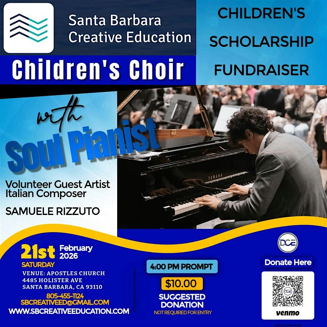 Event is free, with a suggested donation of $10.00 per person. Net funds are for youth scholarships. Venue has parking and is accessible. Open seating. Acclaimed pianist, Samuele Rizzuto will share his original compositions and accompany the Creative Children's Choir.