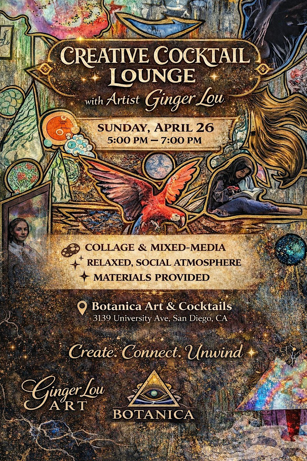 For this special event, Botanica Art & Cocktails transforms into an open creative lounge, where guests are invited to explore collage and mixed-media art in a relaxed, social atmosphere.