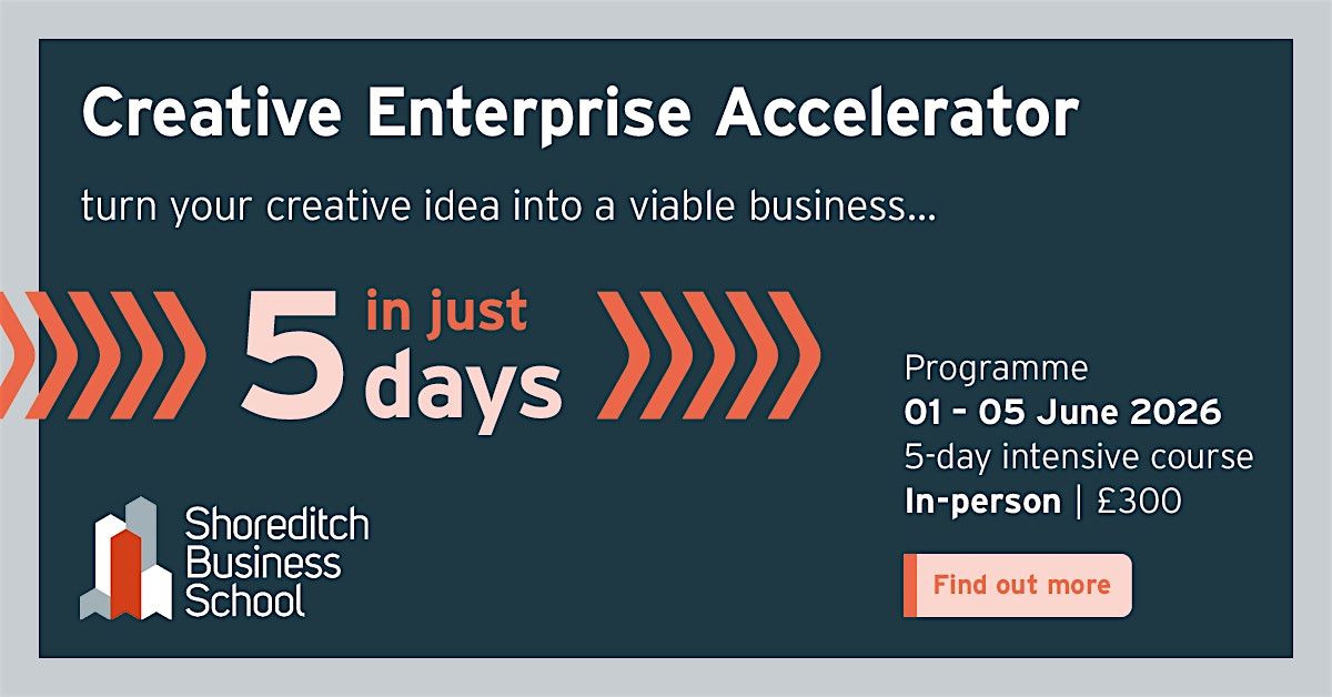 The Creative Enterprise Accelerator is a five-day intensive programme designed to help creators and founders turn their ideas into a viable business model. This is a practical, fast-paced series of workshops helping you to move from idea to income generation.