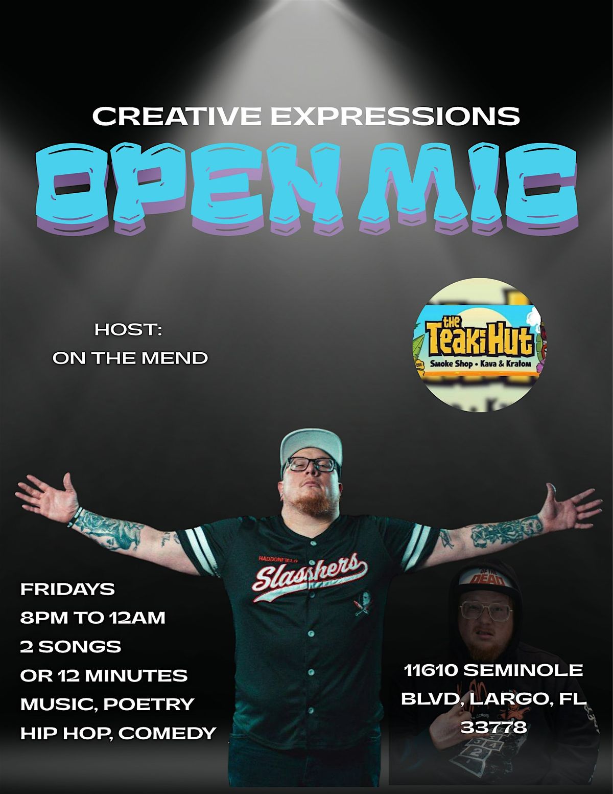 Creative Expressions Open Mic is where Tampa Bay creatives come to show out, try new material, and tap into real opportunities. Every Friday night, The Teaki Hut Smoke Shop • Kava & tea becomes a space for bold voices, fresh energy, and authentic performance.This is a vibe-forward open mic built for artists who want more than just stage time. Whether you’re testing new music, refining your set, or stepping into the spotlight for the first time, this room is about expression, connection, and momentum.