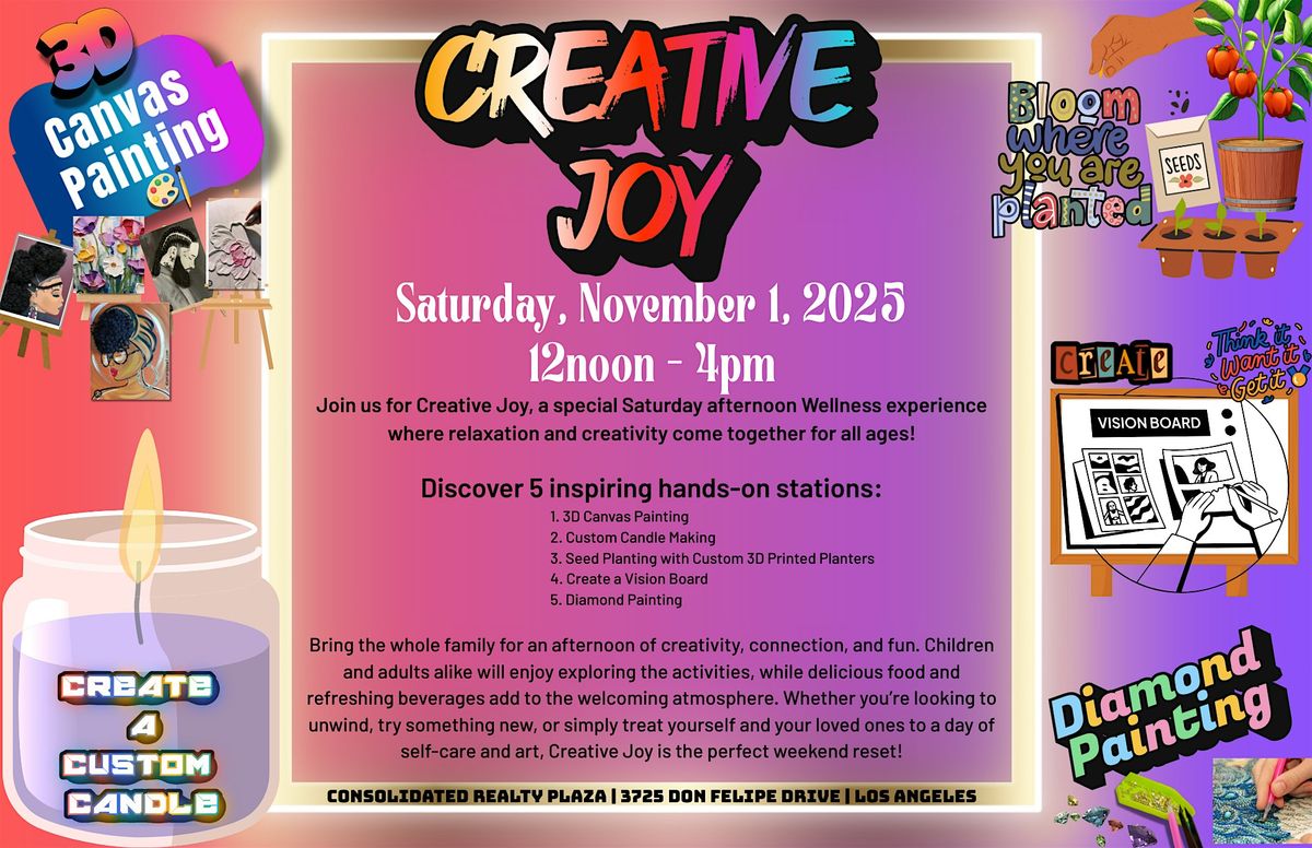 Welcome to the third edition of Creative Joy! Join us for a day filled with creativity, inspiration, and fun activities. Let your imagination run wild as we explore different art forms and express ourselves freely, from Candle Making, Canvas Painting, Diamond Painting and Seed Planting . This in-person event will be held at 3725 Don Felipe Dr, so mark your calendars and get ready for a day of artistic bliss. Don't miss out on this opportunity to connect with fellow creatives and unleash your inner artist. Candle making is limited and will be on a first come bases (1pm-2pm).Kids are welcome, see you there!