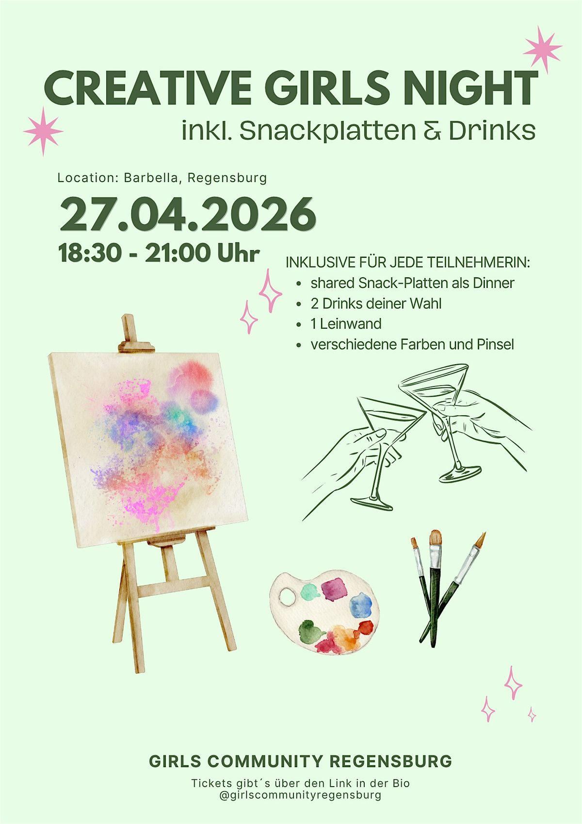 Hey Mädels! 🎨✨ Kommt vorbei zur Creative Night in Regensburg – ein entspannter Abend nur für uns in der Girls Community. Lasst uns zusammen kreativ werden, quatschen und einfach eine tolle Zeit haben. Wir werden Leinwände bemalen, unsere Kreativität ausleben und dabei neue Girls kennenlernen. Das ist dein Vibe? Dann bist du hier genau richtig! Alles in Person, also freut euch auf coole Vibes und echte Begegnungen. Wir sehen uns! <3