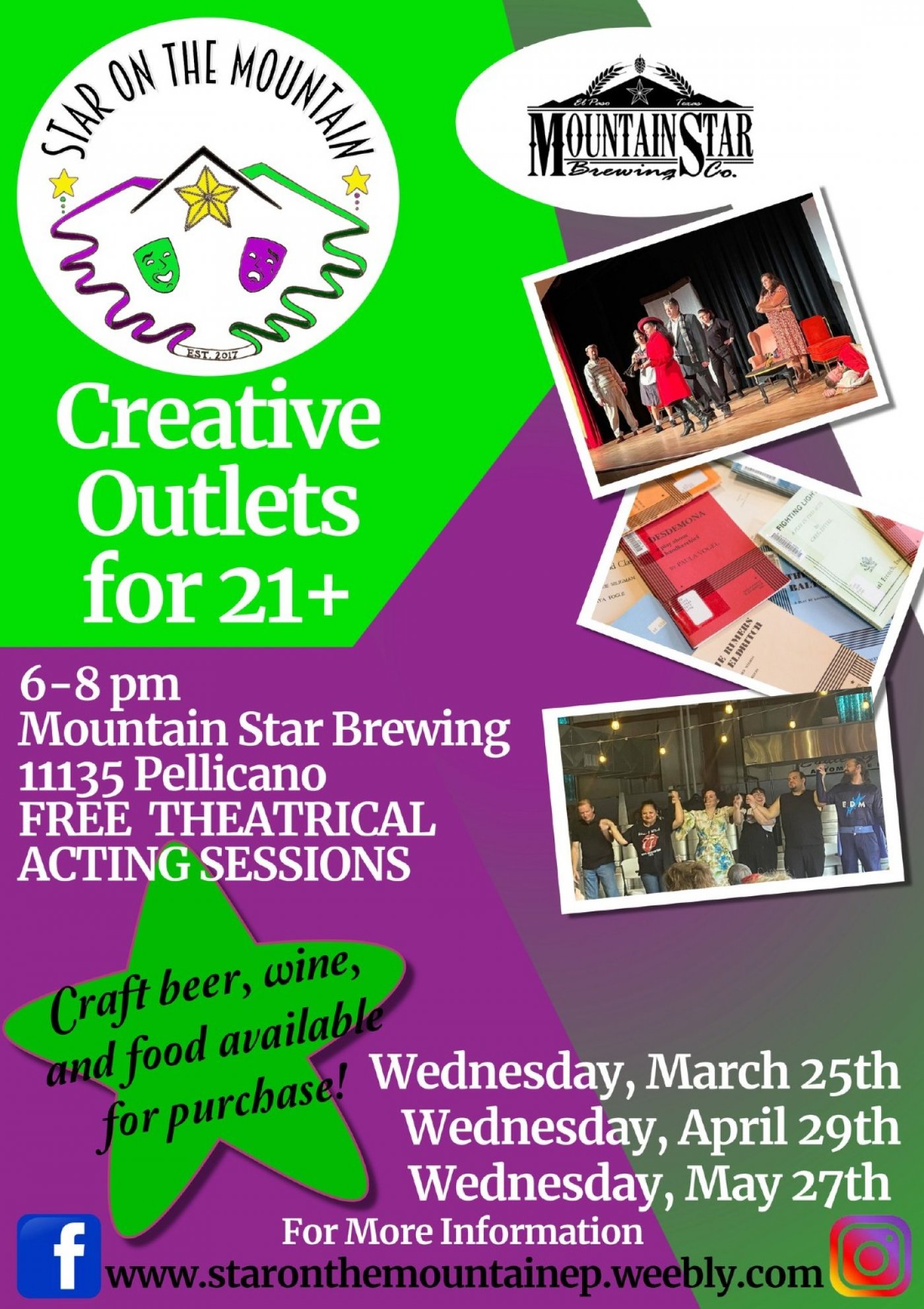 Join us for some theatrical fun! Feel like stretching your creative muscles? Join us for some scene work, monologues, duets, etc.! No experience required. Just come out and join in the fun and meet some new people! Great opportunity to network and check something off your bucket list to see if you get bitten by the theatre bug. Already experienced? Join us and share your experiences and expertise! This event is FREE. Be sure to also check out the excellent craft beers, wine, and food that Mountain Star Brewing has to offer!