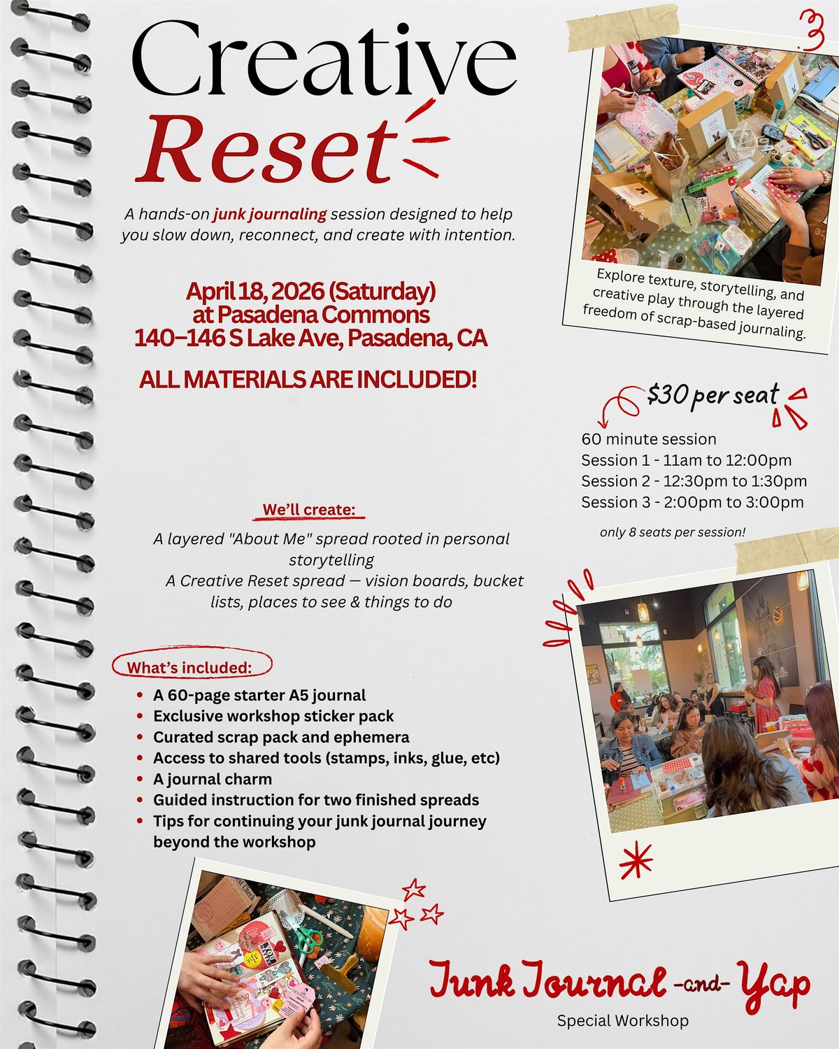 Creative Reset is a hands-on junk journaling session designed to help you tap into personal storytelling through the layered, scrap-based art of junk journaling, no experience necessary.