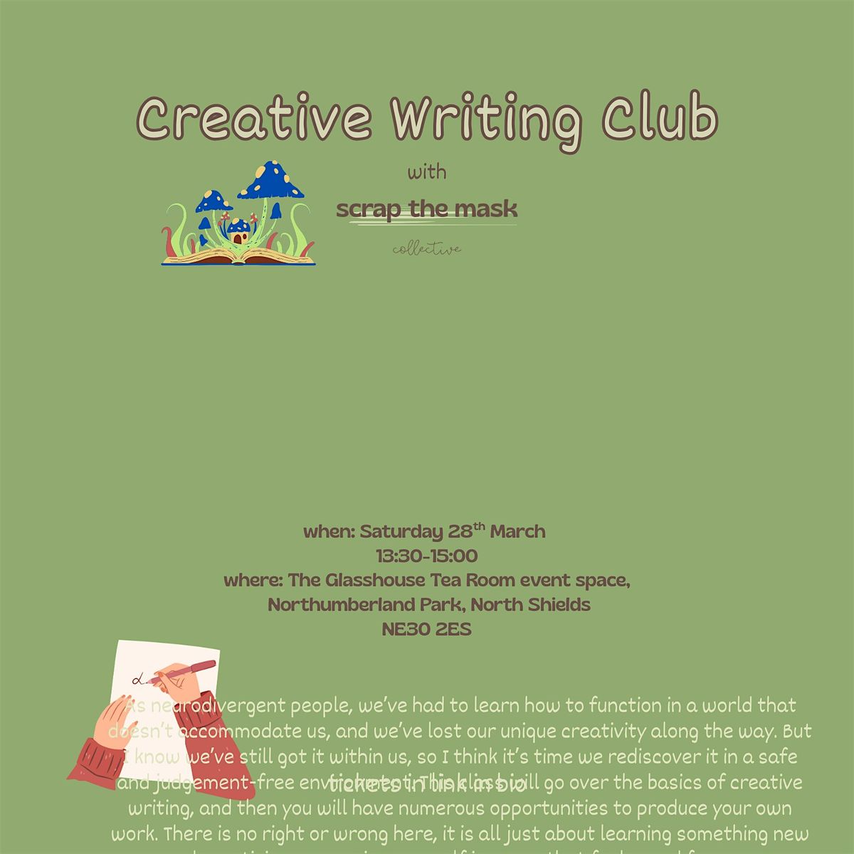 This class will go over the basics of creative writing, and then you will have numerous opportunities to produce your own work. There is no right or wrong here, it is all just about learning something new and practising expressing yourself in a way that feels good for you.