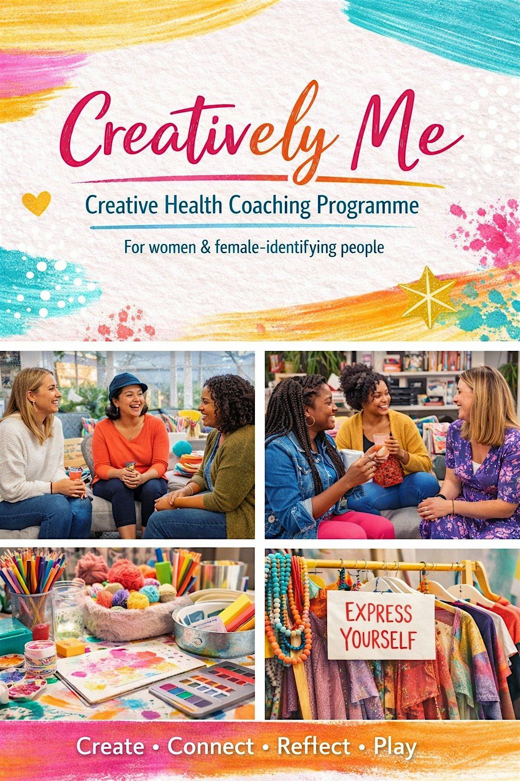 Creatively Me is a small-group Creative Health coaching programme for women and female identifiying people who want to reconnect with their confidence, creativity, and sense of agency — in a space that feels safe, playful, and deeply human.