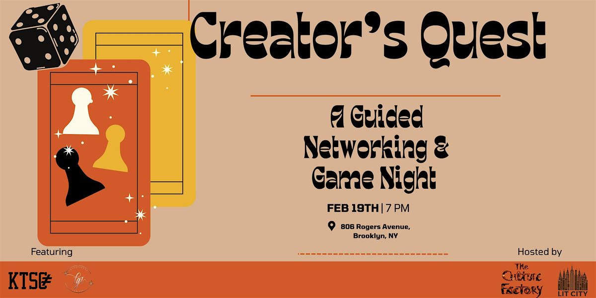 Creator’s Quest is an interactive networking night designed to bring creatives, entrepreneurs, and builders together through guided games, conversation, and community connection. Complete the Quest, enter the raffle, and leave with real connections.