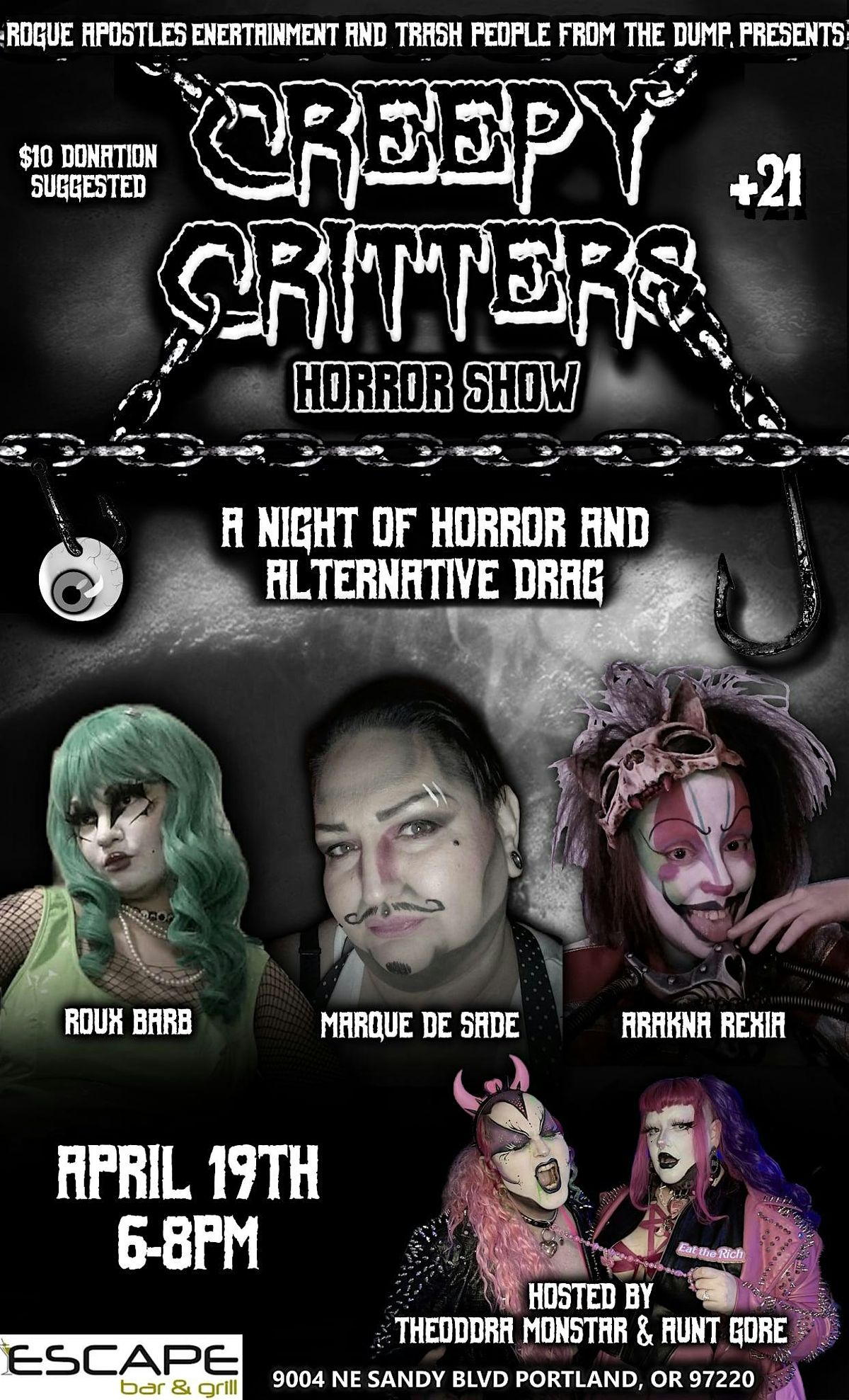 Escape Bar & Grill's Monthly Horror and Alternative Drag Showcase, featuring some of your Favorite Local Drag Performers! No Cover.