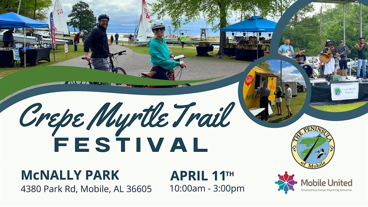 The Crepe Myrtle Trail Festival is a signature annual event where The Peninsula of Mobile teams up with Mobile United to spotlight the beautiful waterfront Crepe Myrtle Bike Trail - starting at McNally Park, traversing the scenic 10.6 miles including the Brookley International Airport and Arlington Park, then circling back to McNally to finish with a big community party!