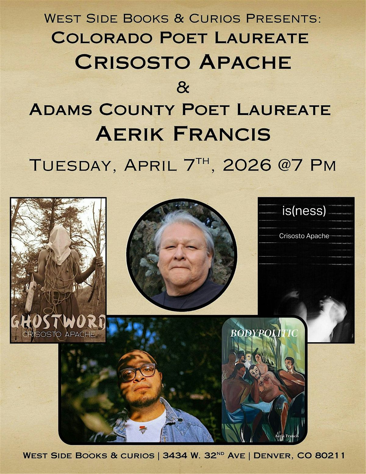 Join us in welcoming CO Poet Laureate Crisosto Apache and Adams County Poet Laureate Aerik Francis on April 7th at 7pmAbout this Event