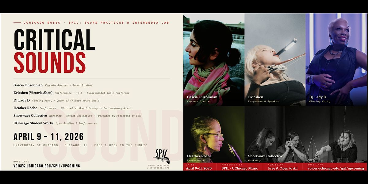 Critical Sounds is a symposium and festival exploring the intersection of sound studies, electroacoustic music, and experimental performance. Bridging academic inquiry with artistic practice, the program features a keynote lecture, live performances, practice-based research, and workshops—including a special session with Chicago’s own DJ Lady D. All events are free and open to the public.