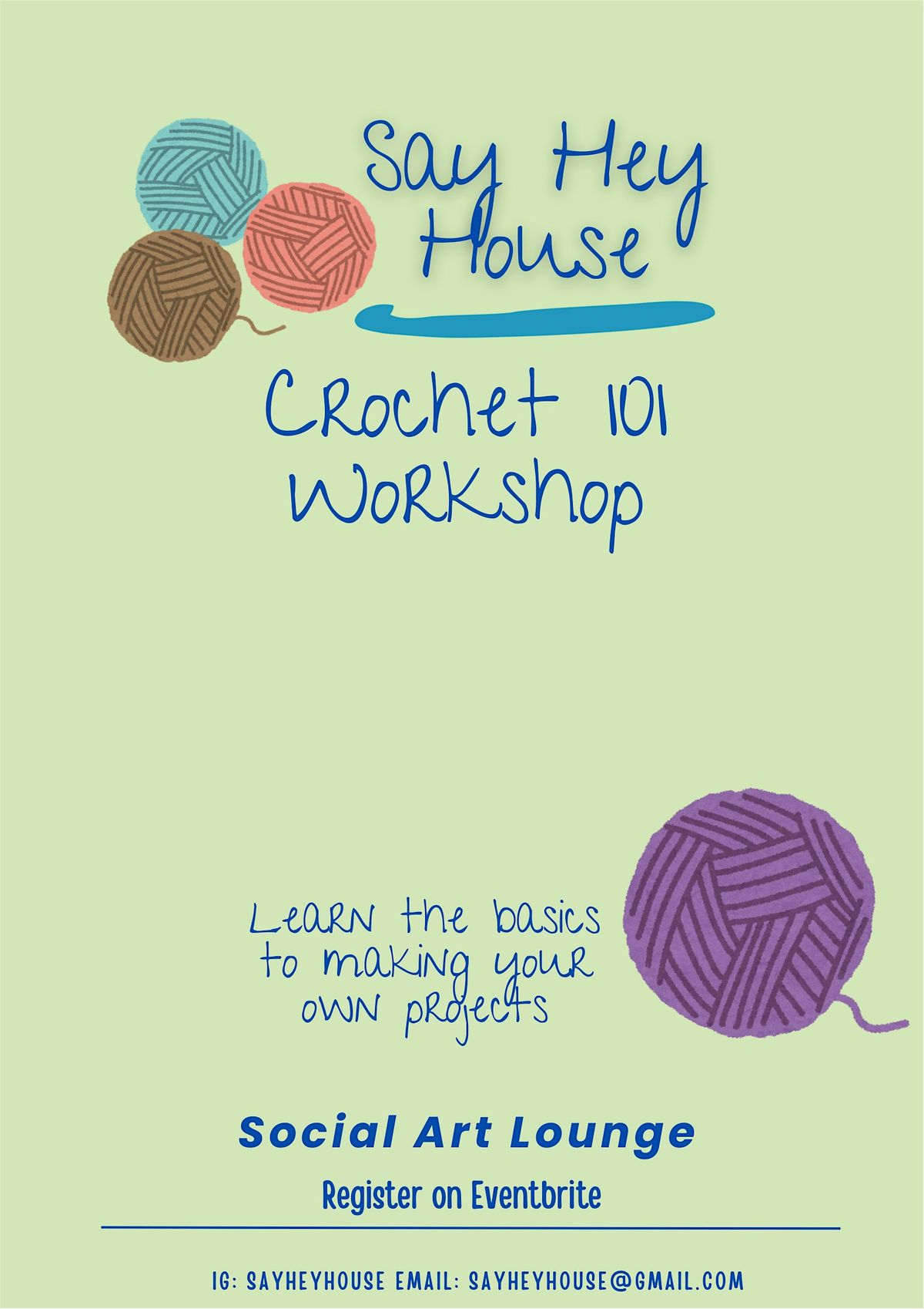 Join us at Say Hey House to learn crochet. Foundation chain, basic stitches, and more tips & tricks for beginners.