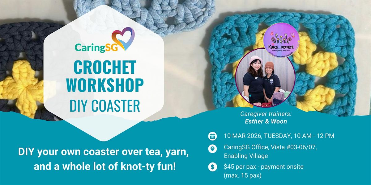 Join caregiver trainers Esther and Woon from Kairos Moment for a cosy crochet session where you’ll learn to DIY your own coaster from scratch. Over tea and easy conversation, you’ll be guided through simple crochet knots and stitches in a relaxed, supportive setting.