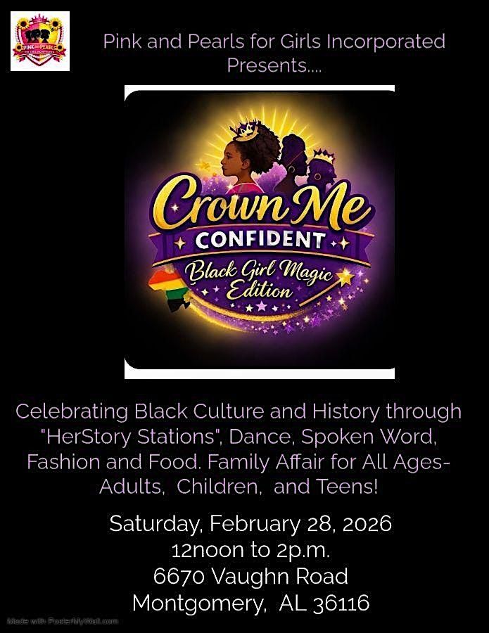 To celebrate Black History, culture, confidence, and self-worth, while reminding every girl that she is royalty—no matter her age: Crown Me Confident- Black Girl Magic Edition. There will be engaging activities such as "Herstory" affirmation Stations and Storytime Royalty for our Little Queens. For our Rising Teen Queens will engage in a Walking in Your Crown Panel and Queen Goals Board.