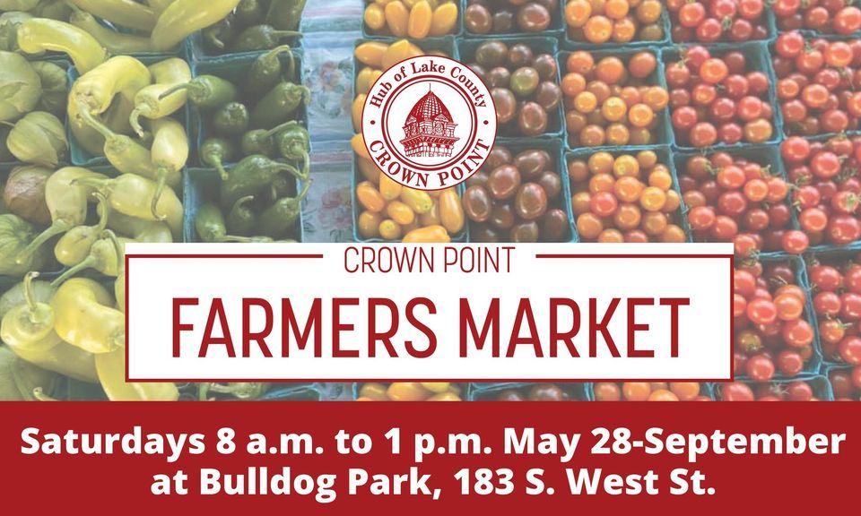 Join us at Bulldog Park every Saturday from 8 a.m. to 1 p.m. beginning May 28 through Sept. 24 for our weekly Farmers Market. Our weekly market features more than 70 artisans, farmers, and more. With various vendors, a splash pad and live music, you are sure to find something the whole family will enjoy!Please note: The Farmers Market will move to the front parking lot of Wheeler Middle School on Saturday, June 4, due to the Crossroads Regional Chamber of Commerce Corn Roast, and on Saturday, July 16, due to The Taste of Crown Point.
