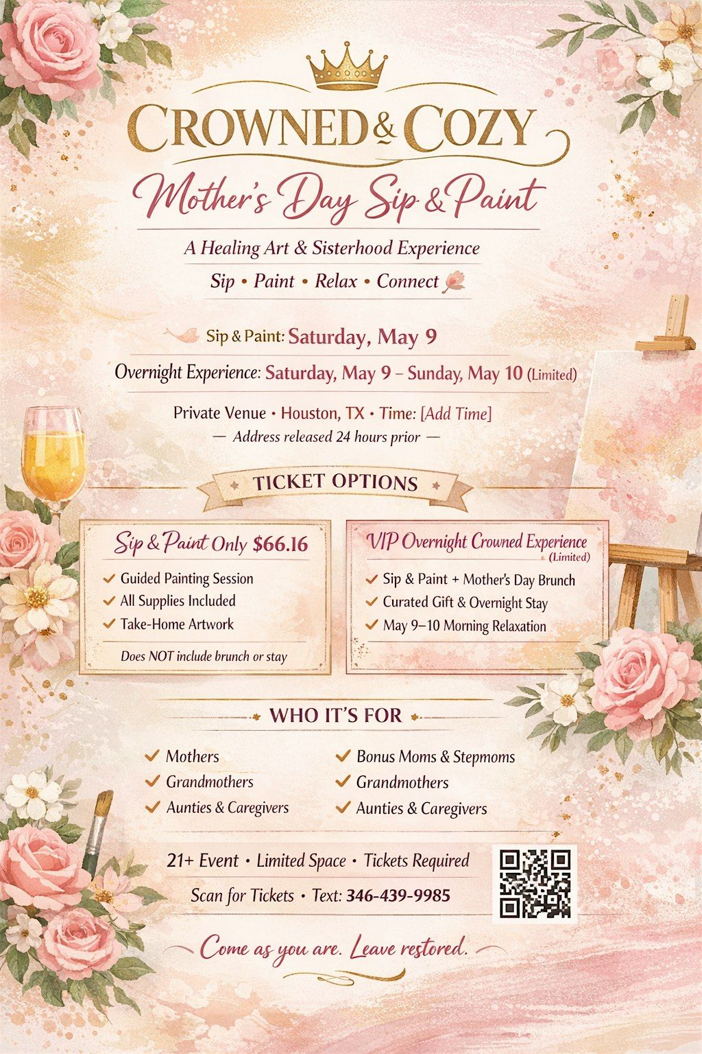 Join us for an intimate Mother’s Day Sip & Paint designed to pour back into women who pour into everyone else. This experience blends creativity, connection, and calm—creating a cozy, uplifting space for mothers and mother figures to unwind, laugh, and express themselves through art.