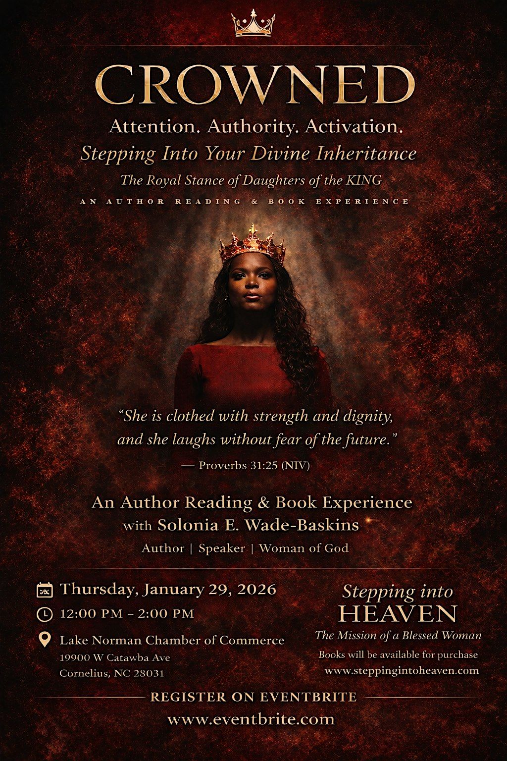As a new year begins, many women find themselves standing at a crossroads—hopeful yet uncertain, faithful yet weary, called yet questioning their next step. CROWNED is a powerful, spirit-led gathering created for women who are ready to rise, reclaim their identity, and step boldly into the authority God has already placed within them.