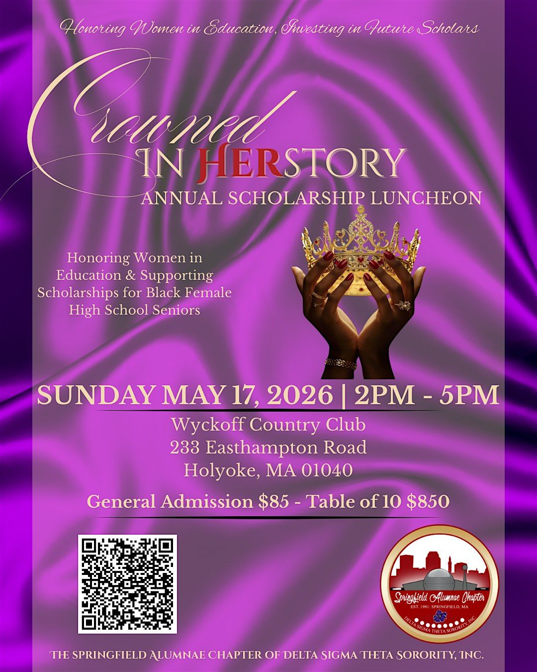Join the Springfield Alumnae Chapter of Delta Sigma Theta Sorority, Incorporated for Crowned in HERstory: Honoring Women Who Educate, Elevate, and Shape the Future, an elegant scholarship luncheon celebrating the power of education and the women who dedicate their lives to shaping the next generation.