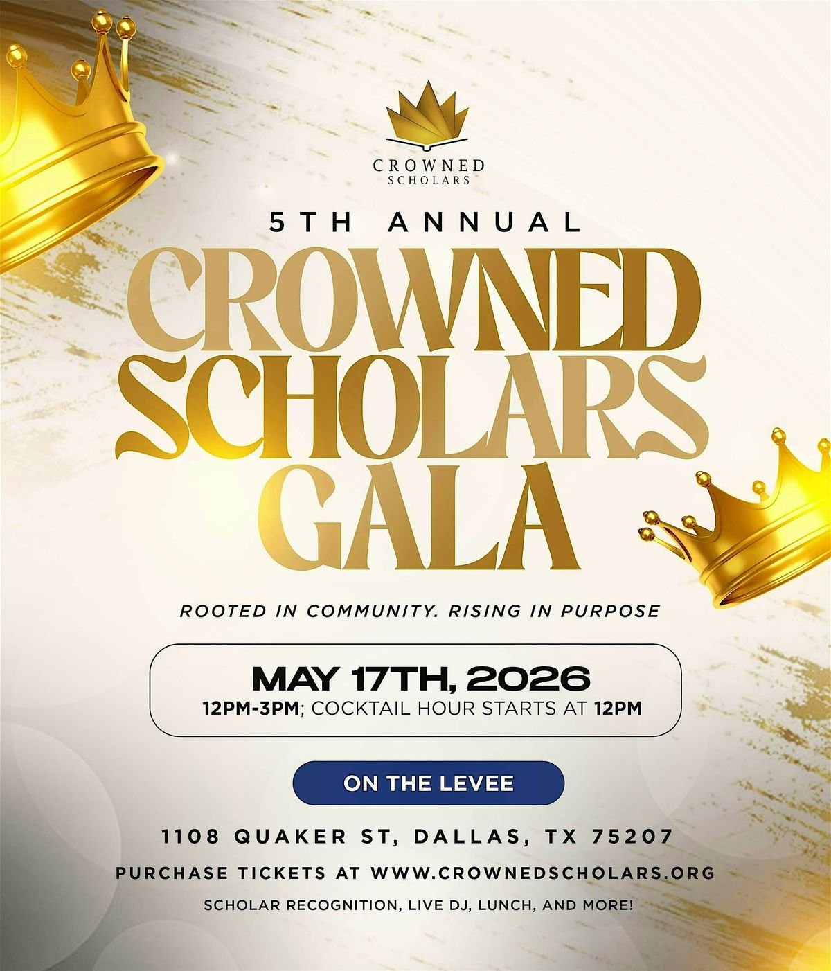 Crowned Scholars is excited to host our 5th Annual Gala on Sunday, May 17th at On The Levee in Dallas, TX. We invite all Scholars, families, friends, and community supporters to join us as we commemorate another year of our organization's impact! This event will feature a lunch menu, live DJ, Scholar awards & recognition, and much more!