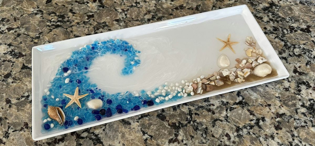 Crushed Glass, Shells, Starfish Resin Charcuterie Tray Paint Art Sip Class