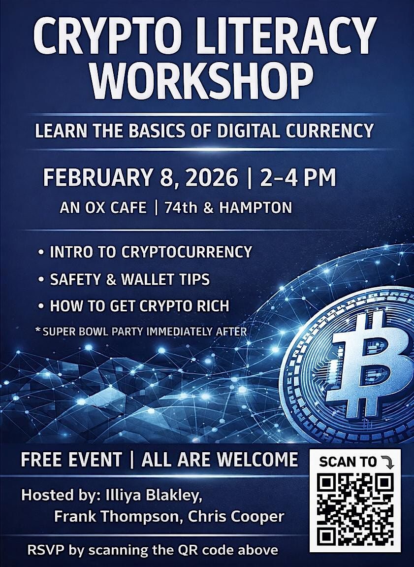 Ready to dive into the world of cryptocurrency? Join us for an in-person Crypto Literacy Workshop where you'll learn the basics, get tips on staying safe, and discover how to navigate crypto like a pro. No jargon, just real talk and hands-on fun. Whether you're a total newbie or just curious, this is the place to be!