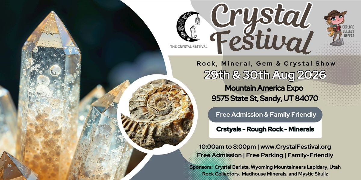 Get ready for one of Utah’s largest and most exciting rock, mineral, gem, crystal, and fossil events of the year! The Crystal Festival returns to the Mountain America Expo Center for two unforgettable days packed with discovery, creativity, and hands-on learning for all ages.Browse and shop from 50+ vendors, including mine owners, mineral and fossil dealers, crystal healers, authors, lapidary artists, and local creators offering everything from rare specimens and gemstones to jewelry, cabochons, fossils, metaphysical tools, and unique gifts.