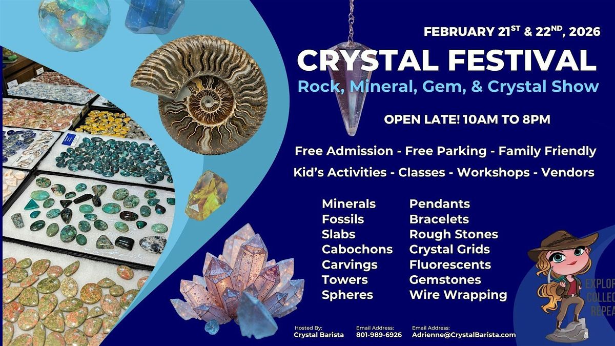 www.CrystalFestival.orgThis family friendly and free event is packed with fun! Come meet mine owners, authors, lapidary artists, crystal healers, readers, and more! We will have a children's geology scavenger hunt, hands on displays, scout presentations and rock related date nights! Save the date and we'll see you at The Crystal Festival February 21st & 22nd in Layton, Utah.