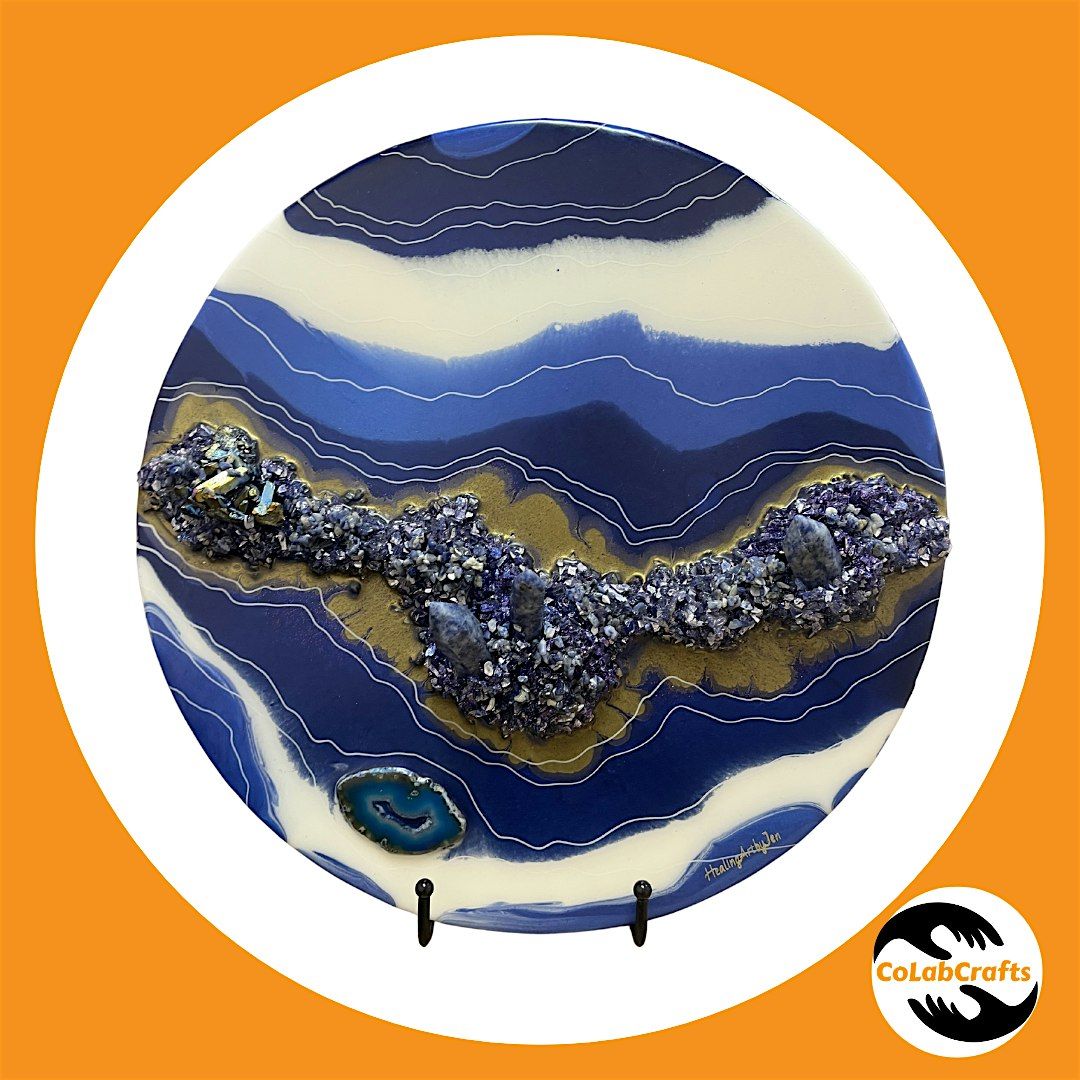 No experience is needed—we’ll guide you step-by-step through the process, from color selection and composition to working safely with resin. You’ll learn how to layer, blend, and embellish your piece to achieve that signature geode sparkle and depth.