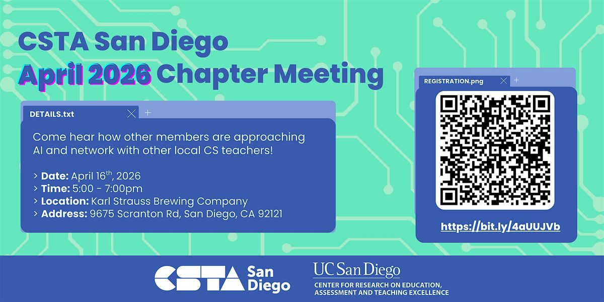 That's right—it's time for our next chapter meeting! This April, stop by the Karl Strauss Brewing Company on April 16th for the opportunity to hear how members are approaching AI and network with your fellow computer science educators from the San Diego area!
