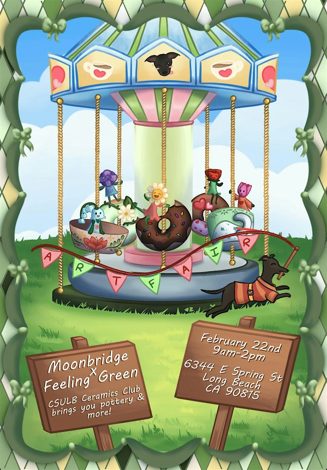 Join CSULB's Ceramics Club and MoonBridge Donuts for an Art Fair on February 22nd! This is a fundraiser for the club, so it would be great if the community could come hang out and check out some local art for sale! There will be ceramics, art prints, jewelry, fiber arts, stickers, and more! This is a student-focused event, and all of the vendors participating are students from the different CSULB art cohorts. This market is also meant to promote the upcoming group show for CSULB Ceramics Club's group show "Feeling Green" opening on 3/1 and on view until 3/5! Stop by to grab a delicious donut and take a look at the many talents of CSULB's art programs :D For more info, feel free to check out our Instagram @csulb.ceramics.club !