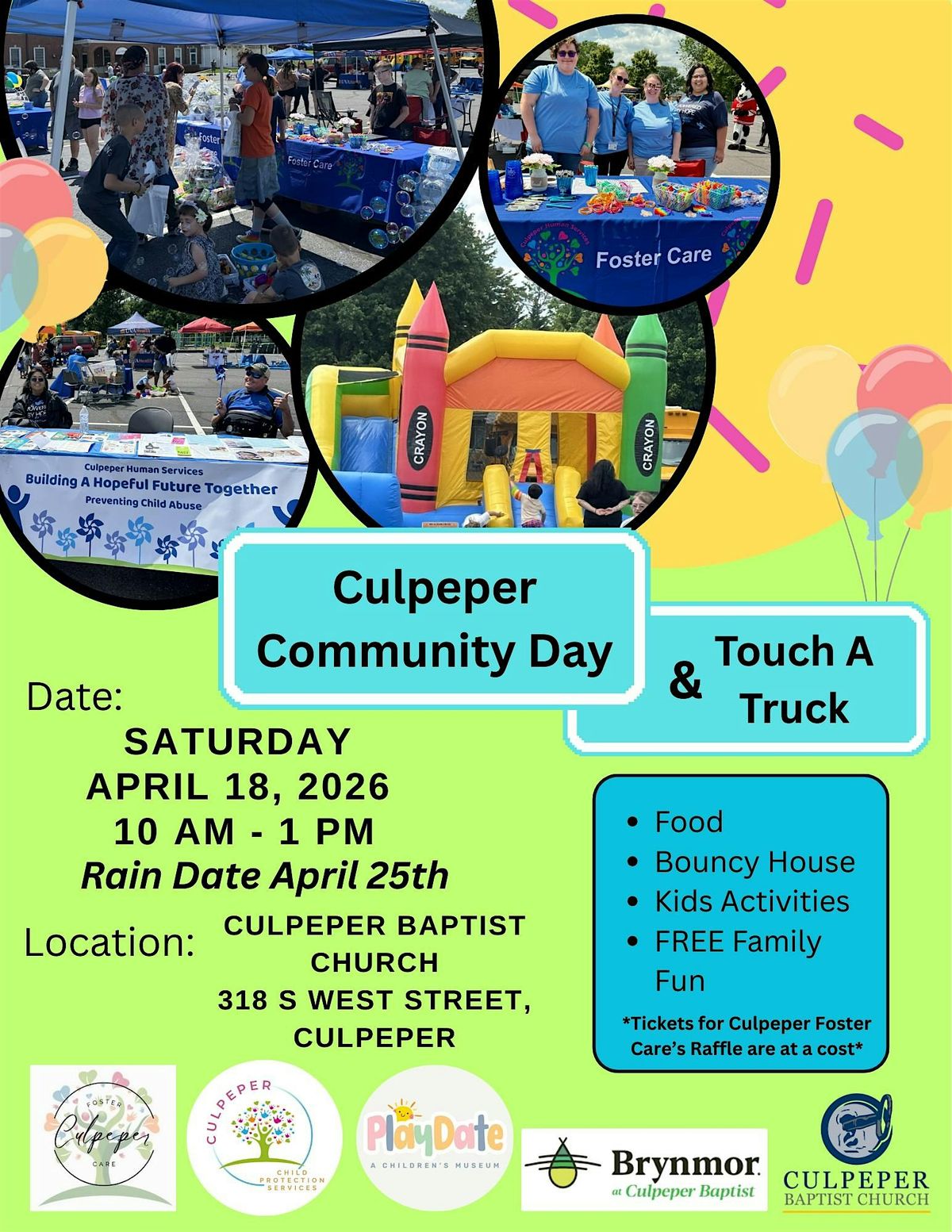Welcome to our Culpeper Community Day & Touch A Truck! Join us for a free fun-filled day of activities for the whole family! Saturday April 18th from 10:00AM to 1:00PM at Culpeper Baptist Church. The rain date for this event is Saturday April 25th from 10:00AM to 1:00PM.